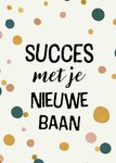 Heeft er iemand een nieuwe baan? Wens hem of haar succes door middel van deze kaart. De kaart wordt gevuld met blauwe stippen. In het midden van de kaart staat de tekst 'Succes met je nieuwe baan'.