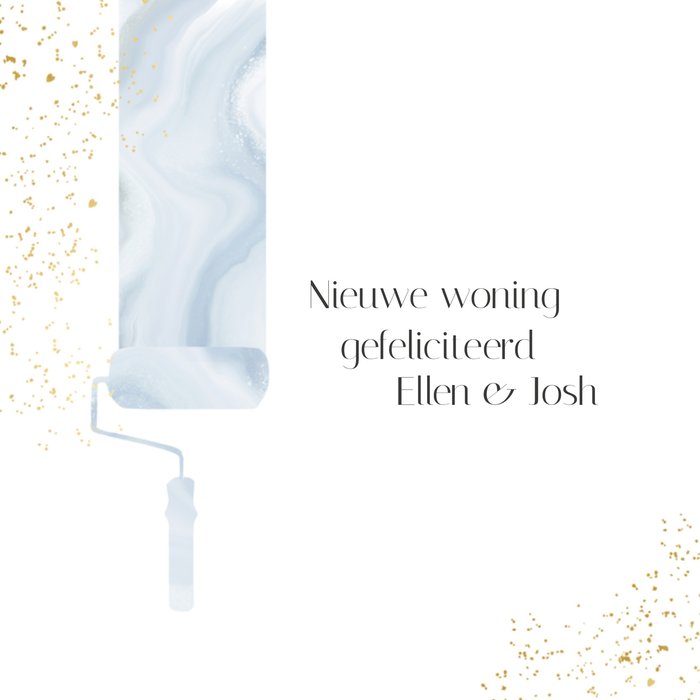 Toepasselijke nieuwe woning kaart met naam op de voorkant. Ook zie je op de voorkant een verfroller.
