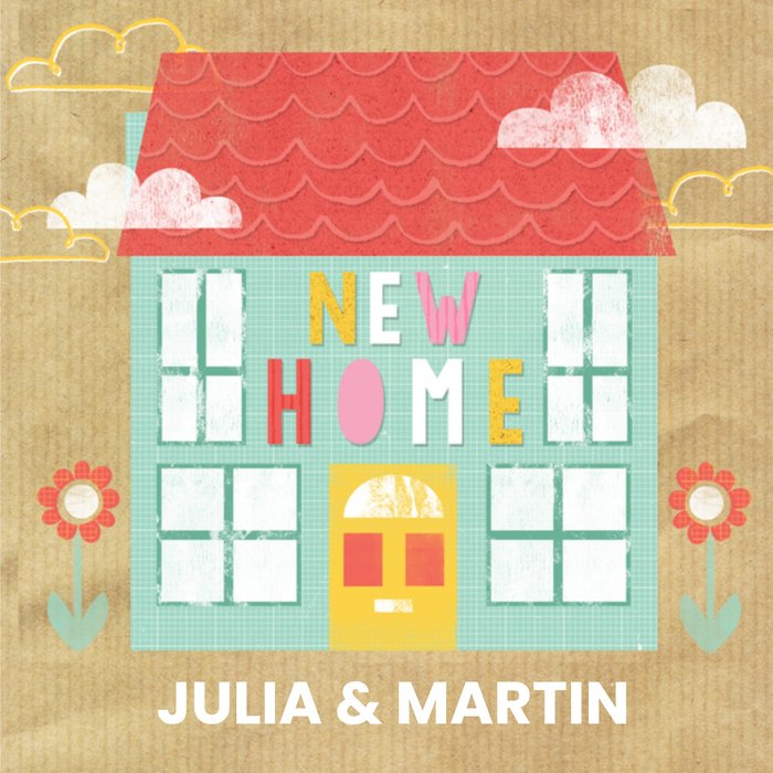 Vrolijke kaart met aanpasbare naam en de tekst: New home
