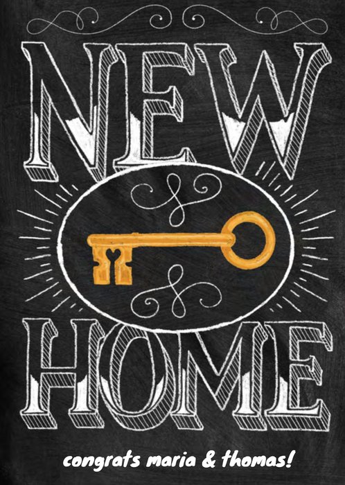 Stoere kaart met aanpasbare naam en de tekst: New home