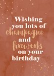 Op deze kerstkaart staat: Wishing you lots of champagne and fireworks on your birthday.