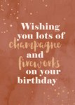 Op deze kerstkaart staat: Wishing you lots of champagne and fireworks on your birthday.