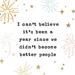 Wens je vrienden en familie een gelukkig nieuwjaar toe met deze nieuwjaarskaart met de tekst: I can't believe it's been a year since we didn't become better people.