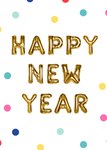 Hoe leuk is deze nieuwjaarskaart met confettistippen. "Happy new year" is in gouden folieballonnen geschreven.