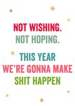 Grootse plannen voor het nieuwe jaar? Laat dingen gebeuren en motiveer anderen om hetzelfde te doen. Een grappig nieuwjaarskaartje met de tekst: 'Not wishing. Not hoping. This year we're gonna make shit happen.'