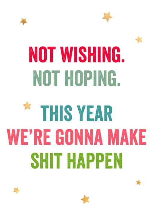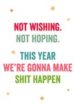 Grootse plannen voor het nieuwe jaar? Laat dingen gebeuren en motiveer anderen om hetzelfde te doen. Een grappig nieuwjaarskaartje met de tekst: 'Not wishing. Not hoping. This year we're gonna make shit happen.'