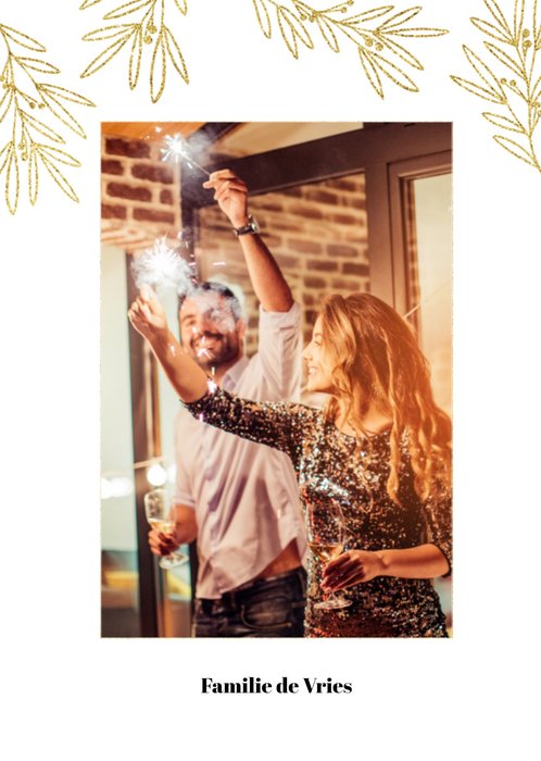 Voor de feestdagen een leuke nieuwjaarskaart met foto. De gouden takjes boven jouw eigen foto maakt het plaatje helemaal compleet.