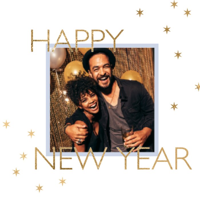Een Happy New Year verstuur je met deze frisse nieuwjaarskaart. Een kaart met witte achtergrond en gouden sterretjes waar je jouw eigen foto aan toevoegt.