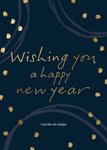 Wens vrienden en familie een gelukkig nieuwjaar met dit hippe nieuwjaarskaartje. Donkerblauw met gouden accenten en tekst: "Wishing you a happy new year".