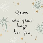 Wens je vrienden of familie veel geluk toe met deze leuke en frisse nieuwjaarskaart met de tekst: Warm new year hugs for you.