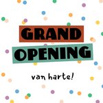 Leuke kaart om iemand succes te wensen met een nieuwe zaak. Op de kaart staat: 'Grand opening, van harte!'
