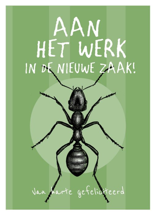 Leuke wenskaart met de illustratie van een mier en de tekst: Aan het werk in de nieuwe zaak! Van harte gefeliciteerd