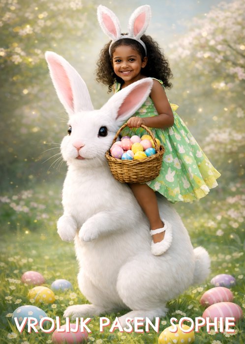 Verras met deze vrolijke paaskaart. De naam en foto zijn aanpasbaar.