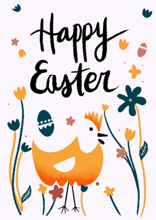 Een grappige kaart voor Pasen met tekeningen van een kip en andere tierelantijnen. Happy Easter.