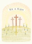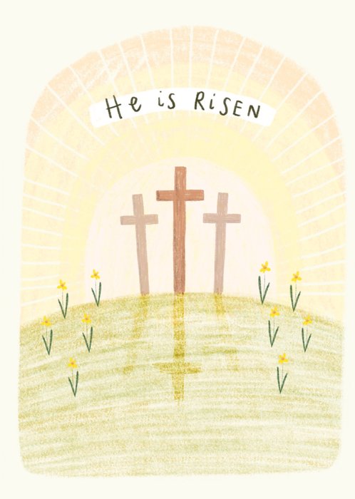 Deze lieve paaskaart is de perfecte wenskaart om naar een speciaal iemand te sturen om te laten zien dat je om hem geeft tijdens deze feestelijke paasperiode. Het toont een potloodtekening van drie religieuze kruisen op een heuveltop, terwijl de grond eronder versierd is met narcissen en de opkomende zon daarachter.
