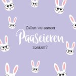 Leuke paarse paaskaart met konijntjes en de tekst: Zullen we samen paaseieren zoeken?