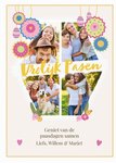 Deze mooie paaskaart is de perfecte wenskaart om naar een speciaal iemand te sturen om te laten zien dat je om hem geeft tijdens deze feestelijke paasperiode. Het beschikt over mooie hangende versieringen, waarvan sommige eivormig zijn, plus bloemen en liefdeshartjes. Er zijn vier foto-uploadgebieden die een zeshoekige vorm vormen.