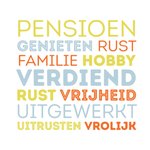 Na zoveel jaren hard werken is het nu tijd voor een welverdiend pensioen. Deze kaart stipt de positieve kanten van het pensioen aan. Genieten, rust vrijheid en uitgewerkt.