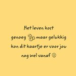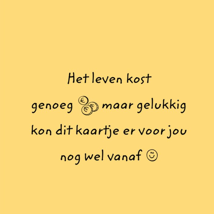 Leuke wenskaart met de tekst: Het leven kost genoeg maar gelukkig kon dit kaartje er voor jou nog wel vanaf.