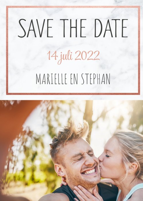 Voeg een leuke foto toe aan deze save the date kaart van Greetz! Ook kun je de datum van jullie huwelijk en jullie naam op de voorkant zetten.