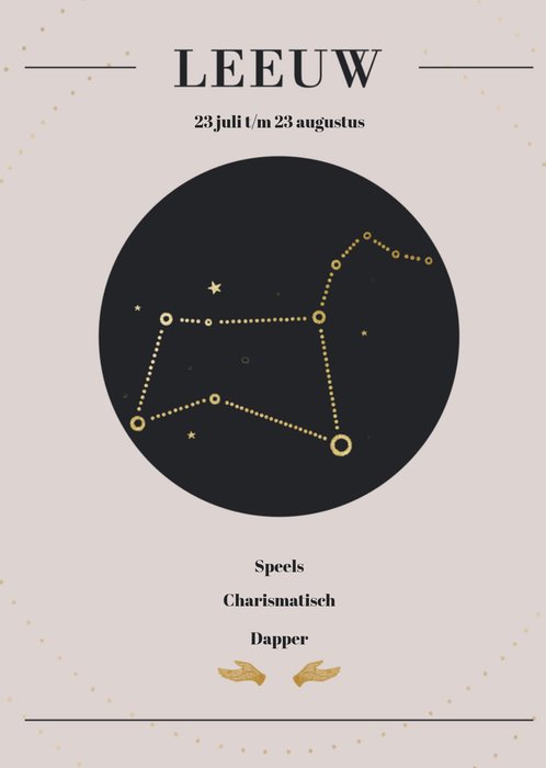 Dit is toch geweldig! Een sterrenbeelden kaart voor het sterrenbeeld leeuw. Een leeuw is jarig tussen 23 juli en 23 augustus. De eigenschappen zijn aanpasbaar.