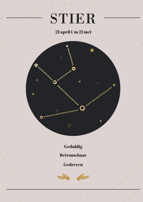 Dit is toch geweldig! Een sterrenbeelden kaart voor het sterrenbeeld stier. Een stier is jarig tussen 21 april en 21 mei. De eigenschappen zijn aanpasbaar.