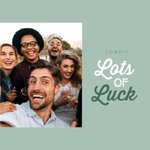 Fotokaart om succes te wensen, met stippen en blaadjes en de tekst: Johan lots of luck. De naam is aanpasbaar.