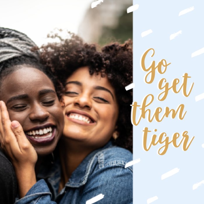 Heeft iemand in jouw omgeving iets spannends in het vooruitzicht. Wens haar haar veel succes met deze leuke fotokaart met de tekst Go get them tiger.