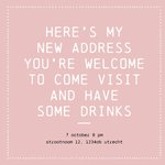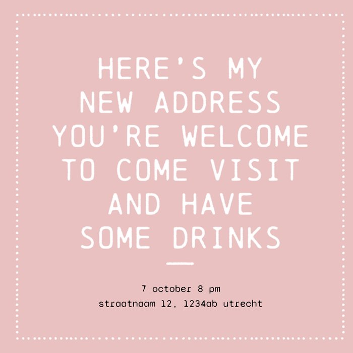 Deze leuke roze verhuiskaart van Greetz is gevuld met de tekst: Here's my new address. You're welcome to come visit and have some drinks. Onderaan kun je je nieuwe adres plaatsen.
