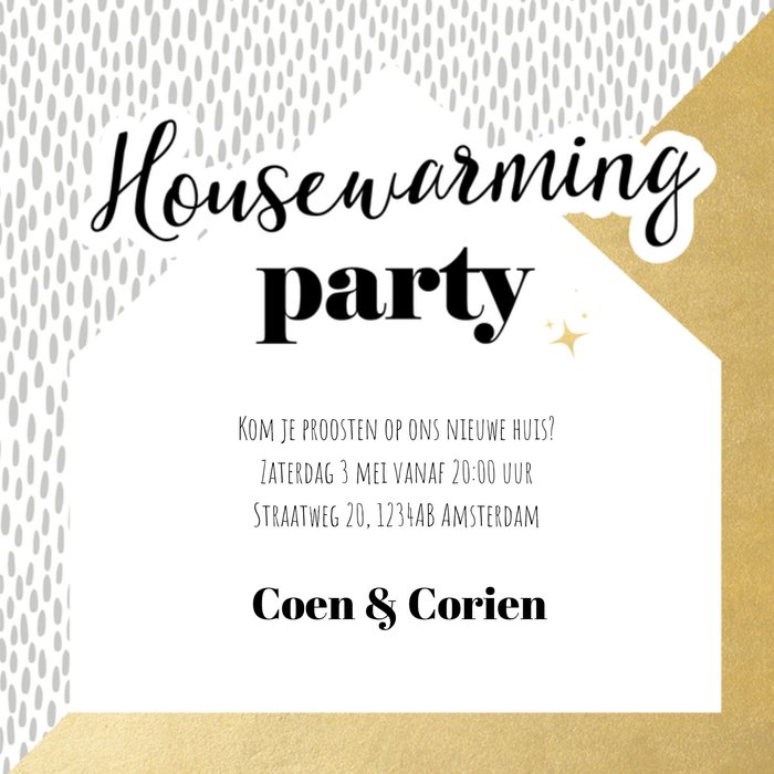 Hippe housewarming uitnodiging van Greetz. Je ziet het sillhouette van een huis. In het huis kun je informatie toevoegen van het feestje.