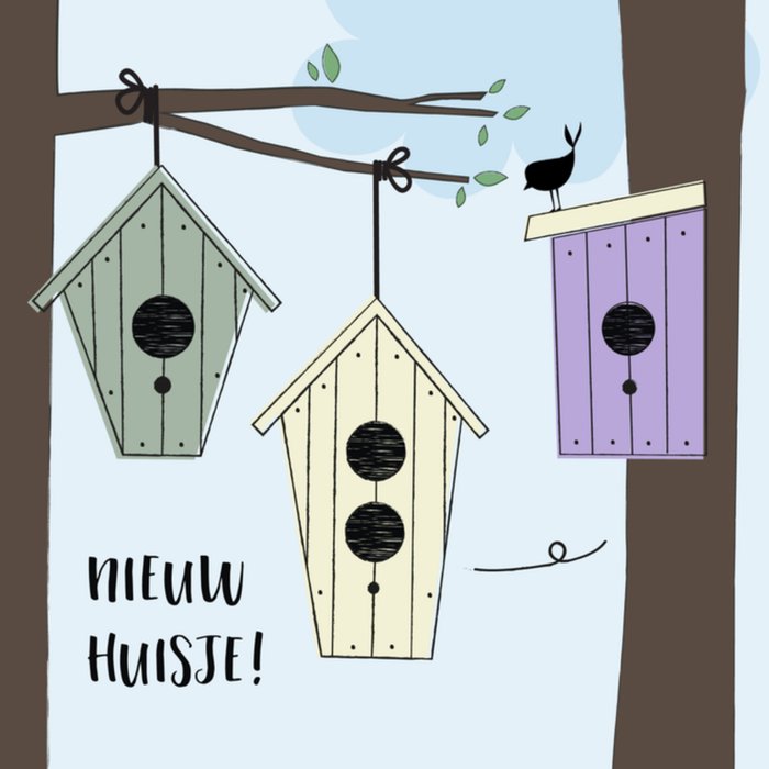 Leuke verhuiskaart met vogelhuisjes en de tekst: Nieuw huisje.