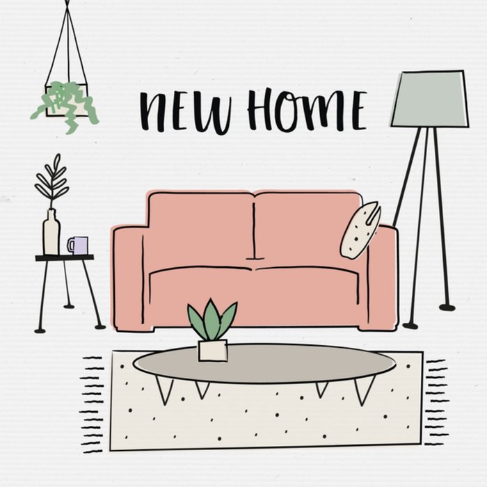 Op deze kaart staat een woonkamer getekend. Met daarin een bank met daarop een lamp, bank, bijtafeltje en plantjes.