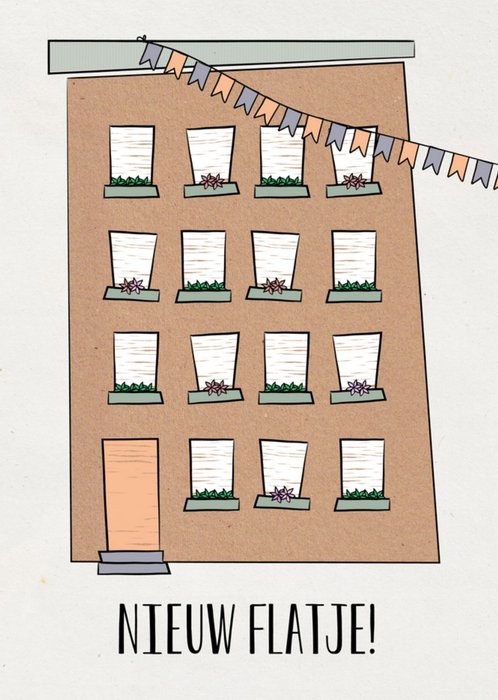 Deze flat bestaat uit een gevel en ramen met verschillende patronen bestaande uit strepen en stippen. Boven staat in fleurige letters: 'Nieuw flatje!'