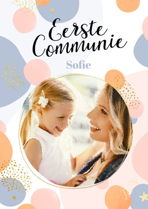 Nodig familie en vrienden uit voor de doopfeest van jouw dochterje door deze leuke uitnodiging te maken. Plaats een lieve foto van je kindje op de uitnodiging. Op de uitnodiging staan gekleurde stippen. Ook kun je een naam toevoegen.