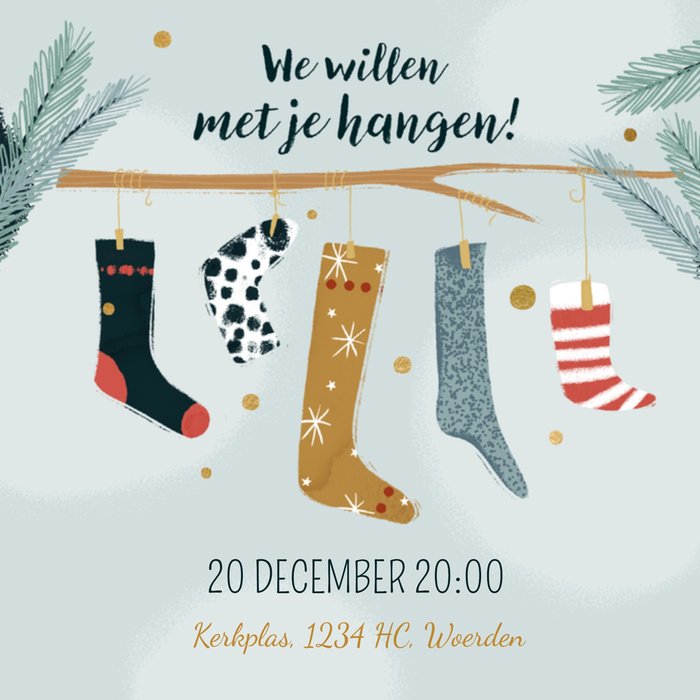 Leuke uitnodiging voor een kerstdiner met illustratie en aanpasbare tekst.