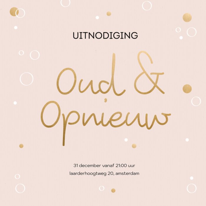 Dit jaar mooi? Volgend jaar nog mooier! Nodig vrienden en familie uit voor jouw oud & opnieuw party met deze uitnodiging met bubbels. De achtergrond is pastel/zalmroze, de letters zijn goud en zwart.