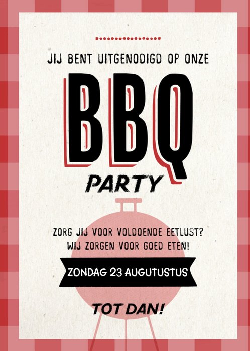 Vrolijke geblokte uitnodiging van Greetz voor een barbecue feest. Op de voorkant kan een en een eigen naam, datum, adres en tijdstip worden toegevoegd.