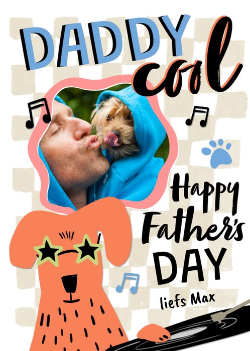 Stoere Vaderdagkaart met hond illustratie, een foto, en de tekst: 'Daddy Cool, Happy Father's Day, liefs Max.' Verras iemand met deze vrolijke Vaderdagkaart van Moonpig.