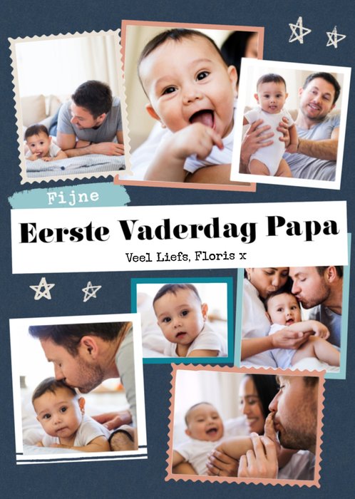 Lieve fotokaart met aanpasbare naam en de tekst: Fijne eerste Vaderdag papa veel liefs [naam]