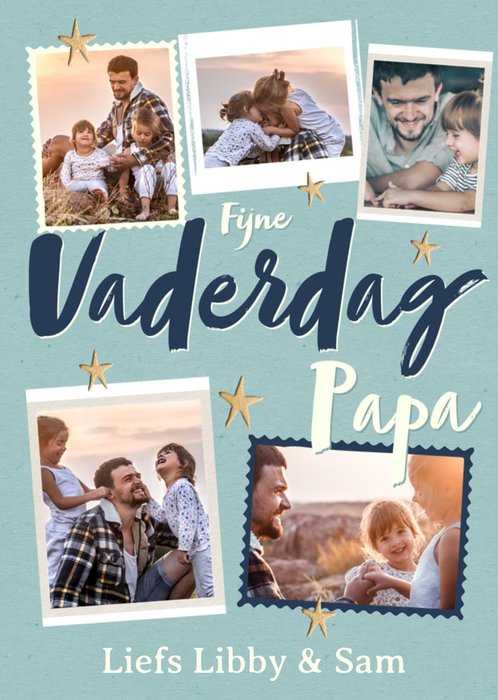 Stoere Vaderdagkaart met 5 fotos, gouden sterren, en de tekst: 'Fijne Vaderdag Papa, liefs Libby & Sam.' Verras iemand met deze vrolijke Vaderdagkaart van Moonpig.