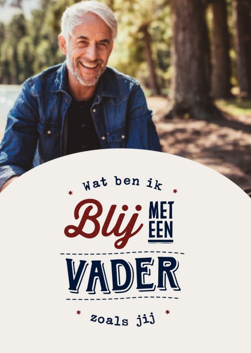 Verras jouw vader voor Vaderdag met deze fotokaart! Aan de rechterkant van de kaart staat de tekst "wat ben ik blij met een vader zoals jij" in een speels design. Aan de linkerkant kan je een eigen foto toevoegen.