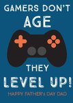 Leuke vaderdagkaart met een controller en de tekst: Gamers don't age they level up! Happy Father's day dad.