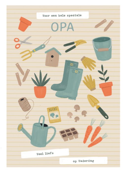 Leuke Vaderdagkaart met tuingereedschap en de tekst: Voor een hele speciale opa, veel liefs op vaderdag.