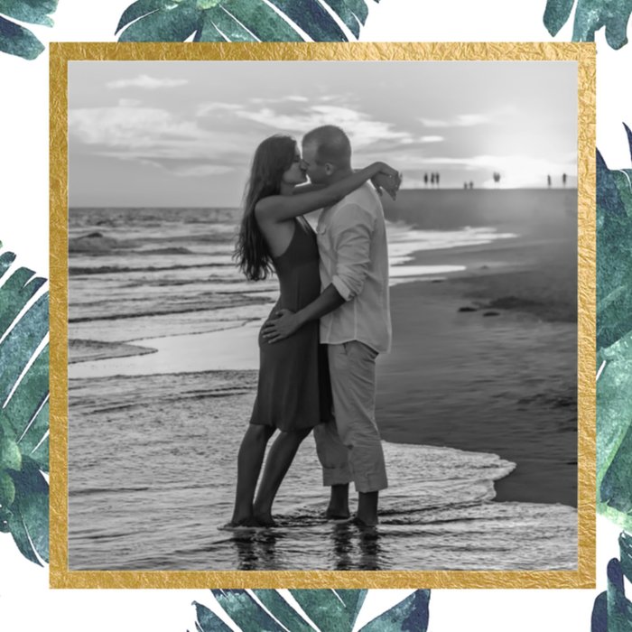 De fotokaart is voorzien van een kader in de kleur goud en groene bladeren.