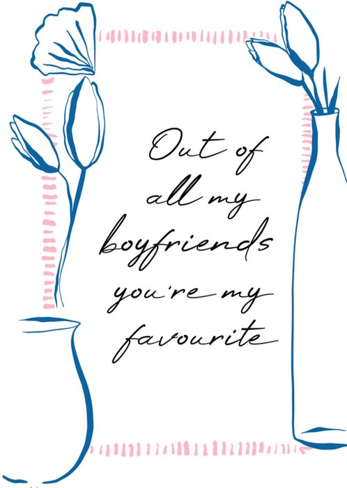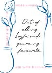 Typografische valentijnskaart met vaas met tulpen en de tekst: 'Out of all my boyfriends you're my favourite'. Verras iemand met deze kleurrijke valentijnskaart van Greetz.