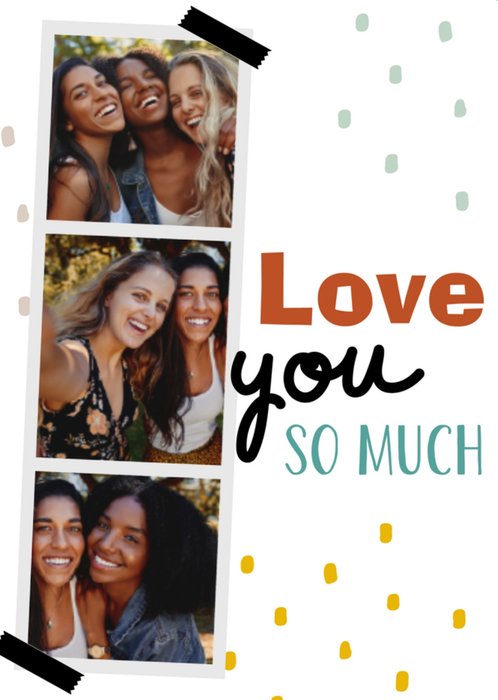 Op deze leuke valentijnskaart voor je vriendin staat: Love you so much. Je kunt ook drie foto's toevoegen.