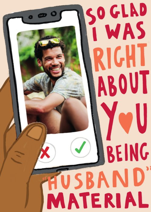 Leuke fotokaart met de tekst: So glad I was right about you being husband material.
