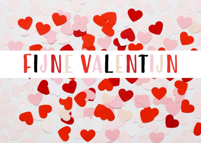Kleurrijke Valentijnskaart met roze en rode hartjes en de tekst: Fijne valentijn