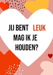 Op deze leuke valentijnskaart staat: Jij bent leuk mag ik je houden?