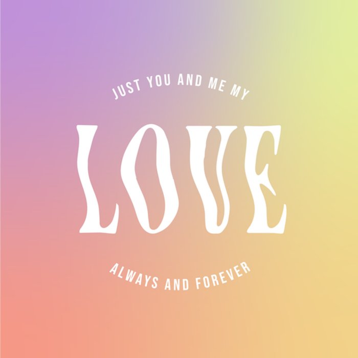Typografische valentijnskaart met de tekst: 'Just you and me my love. Always and forever'. Verras iemand met deze kleurrijke valentijnskaart van Greetz.